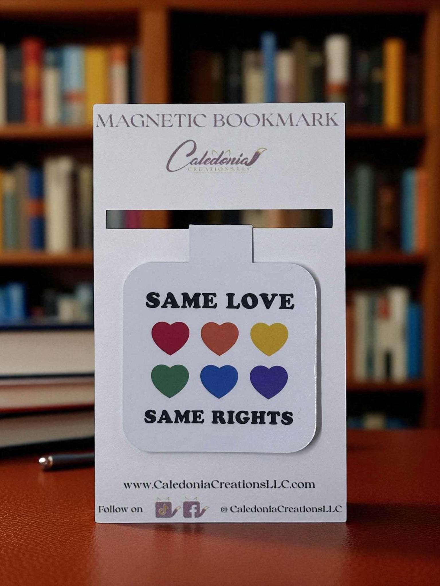 Keep your place with pride using the playful "Same Love, Same Rights" magnetic bookmark. Its strong magnets gently grip your pages without damage, making it a perfect companion for readers who believe in equality and love. Add a touch of fun and meaningful support to every book you open!